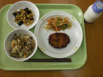 「ひじきごはん、手作りさつまあげ、糸寒天と野菜の和え物、こんぶ豆、牛乳」です。