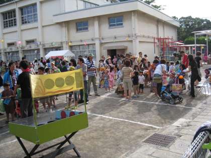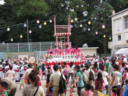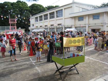7月17日(土)恒例の「世田谷小こどもまつり」が開かれました。第13回を迎えるこどもまつりは、「世田谷小学校遊び場開放運営委員会」の主催で開かれています。今年は天候にも恵まれ、世田谷小学校の児童はもちろんのこと、近隣の子どもたちや卒業生、さらに転校していったお友達など昨年を上回る参加人数でした。校外の各地域ブロック、いぶき、同窓会、町会、卒業生、バレー部、FC世田谷、児童館、町内会、桜木駐在所、教職員等から模擬店やゲームコーナーの出店等があり大盛り上がりでした。盆踊りは「すみれ会」の皆さんの指導でやぐらの周りにかわいい輪ができました。また、お母さんたちのパラパラも大いに盛り上がりを見せていました。