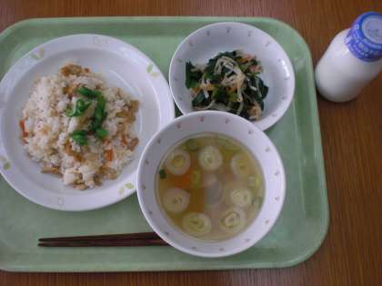 「子ぎつねごはん、おひたし、三平汁、牛乳」です。