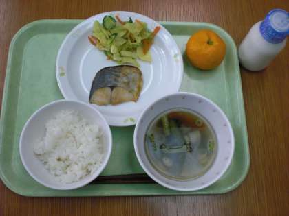 「ごはん、魚の西京焼き、即席漬、せたがや根菜汁、みかん、牛乳」です。