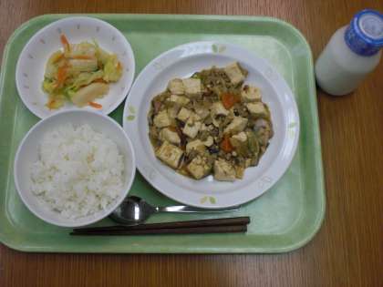 きょうは「家常豆腐」です。「家」、「常」、「豆腐」と書いて、「ジャーチャンドウフ」、または「ジャージャンドウフ」と読みます。中国全土で食べられる一般的な豆腐料理です。漢字からもわかるように、家庭で常によく食べられる豆腐料理という意味です。作り方はいろいろあり、豆腐に片栗粉を振って揚げてから使ったり、生揚げを使う場合もあります。給食の家常豆腐は、豆腐をそのまま使い、トウバンジャンで少し辛みをつけています。
