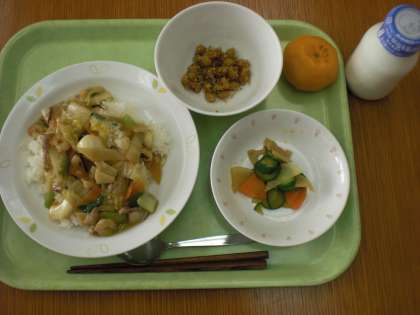 「中華丼、大豆とじゃこの甘辛あげ、シャキシャキ野菜、ぽんかん、牛乳」です。