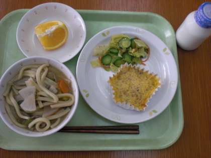 「みそ煮込みうどん、卵焼き、野菜のごま風味、いよかん、牛乳」です。