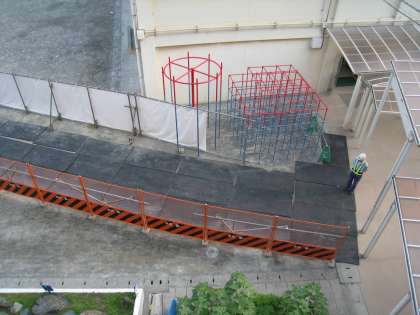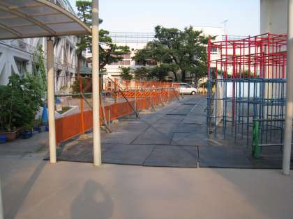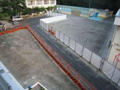 夏休みの期間を使い、東校舎の新BOP室と図書室の入れ替え改修工事が行われます。工事の資材搬入等で、校庭に工事車両の搬入路と資材置き場の囲いが設置されました。