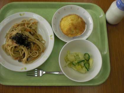 「和風スパゲッティ、りんごと白菜のサラダ、洋梨のコンポートケーキ、牛乳」です。