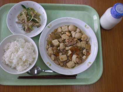 「ごはん、豆腐の五目炒め、白菜の中華サラダ、牛乳」です。