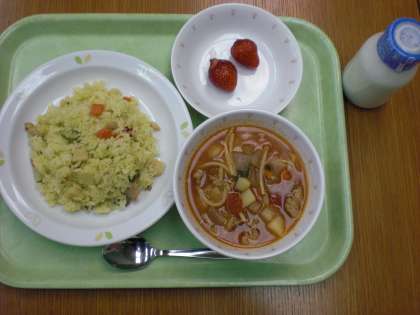 「パエリア、ミネストローネ、いちご、牛乳」です。