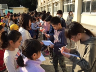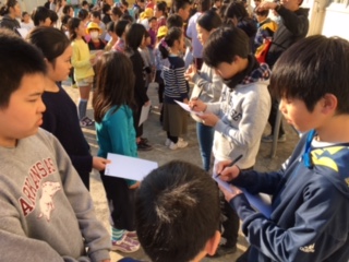 今朝の児童集会はサイン集会でした。6年生から色紙にサインして貰います。1列に並んだ39人の6年生の前に、5年生以下の子供達が長蛇の列を作って順番を待ちます。15分間で15人以上なサインを集めた子供もいました。まだ集めたい子供は休み時間に集めていいことになっています。6年生の中には、この日の為に素敵なサインを考えた子供もいました。