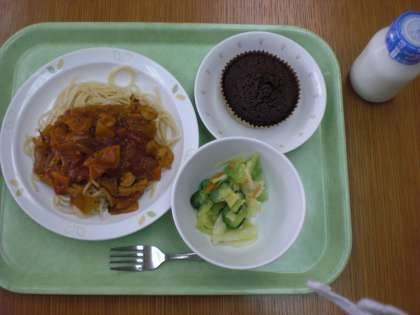 「スパゲッティ地中海ソース、フレンチサラダ、チョコカップケーキ、牛乳」です。