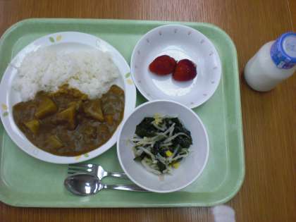 「カレーライス、和風サラダ、いちご、牛乳」です。