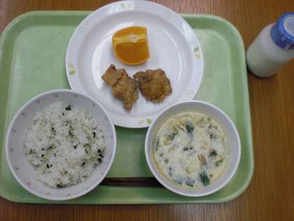 「わかめとじゃこのごはん、鶏肉のからあげ、にらたまスープ、せとか、牛乳」です。