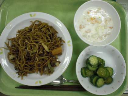 「ソースやきそば、きゅうりの中華味、フルーツヨーグルト、牛乳」です。