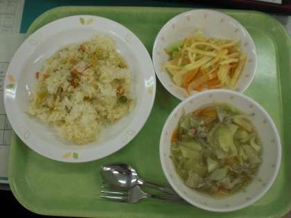 「3色ピラフ、ベーコンと野菜のスープ、ジャガイモのハニーサラダ、牛乳」です。