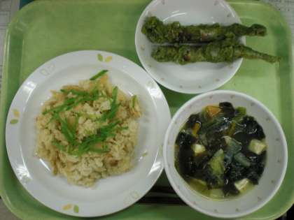 「たけのこごはん、ししゃものからあげ、豆腐汁、牛乳」です。