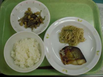 「ごはん、ごま酢かけ、さかなの西京焼き、きざみ昆布の五目煮、牛乳」です。