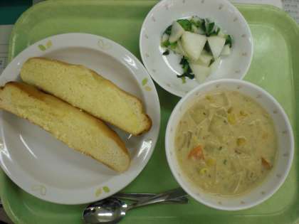 「ガーリックトースト、チャウダー、やさいのレモンかけ、牛乳」です。