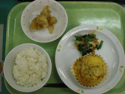 「ごはん、たまごやき、野菜のおかかかけ、じゃがいもの甘辛煮、牛乳」です。