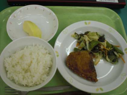 「ごはん、魚の竜田揚げ、春野菜とわかめのサラダ、くだもの、牛乳」です。