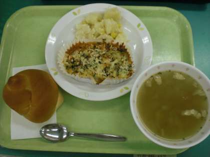 「ミルクパン、とうふのグラタン、コンソメスープ、コーンポテト、牛乳」です。