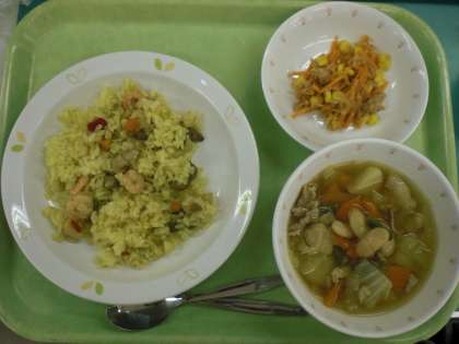 今日はオリンピック給食の日です。1992年バルセロナオリンピックがスペインで行われました。スペイン料理であるパエリアとは、スペイン語でフライパンです。浅いおなべで作るたきこみご飯という意味です。えび、ほたてなど魚かい類のおいしいだしと、カレーのスパイシーな風味をたのしんでください。