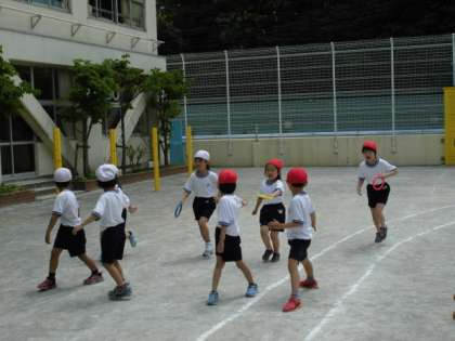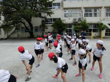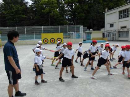 給食の準備の時間をつかって、低学年リレーの練習をしています。