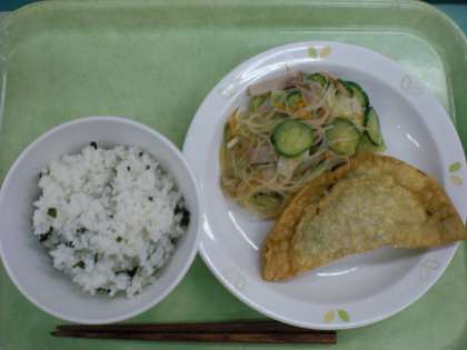 「わかめごはん、ジャンボぎょうざ、はるさめサラダ、牛乳」です。
