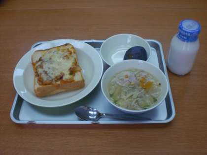 今日の給食は、ピザトースト・ヌードルスープ・プルーン・牛乳です。