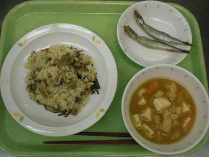 「ぶた肉とごぼうのごはん、焼きししゃも、みそしる、牛乳」です。