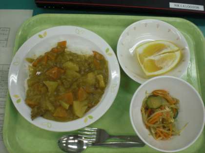 「カレーライス、こんんにゃくサラダ、くだもの、牛乳」です。