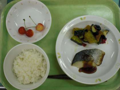 「ごはん、魚の梅肉焼き、夏野菜の南ばんかけ、牛乳」です。