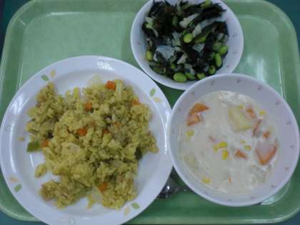 「ツナピラフ、えだまめサラダ、コーンシチュー、牛乳」です。