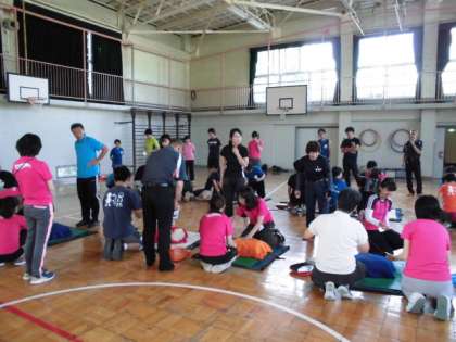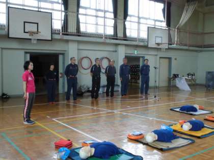 児童は4時間授業でしたが、先生たちは来週から始まる水泳授業に備えて、救命救急法講習会を行いました。