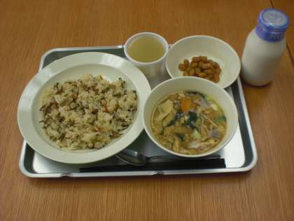 今日の給食は、豚肉とごぼうのごはん・吉野汁・ぶどう豆・りんごゼリー・牛乳です。