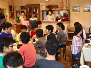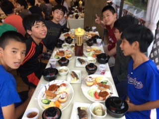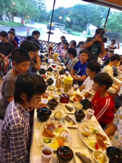 硫黄温泉で楽しく汗を流した後の 6時15分からは、待望の夕食でした。開放的なダイニングで美味しくいただきました。