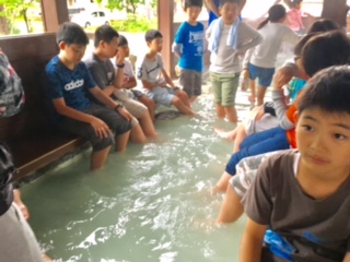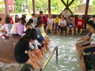 宿に到着後、タオルを持ってすぐそばにある源泉足湯に行きました。ハイキングの疲れが取れました。