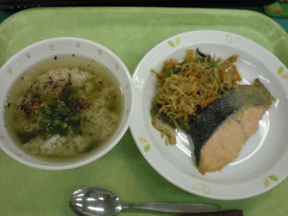 「ひやし梅ちゃづけ、魚の西京焼き、きりぼし大根のにつけ、牛乳」です。