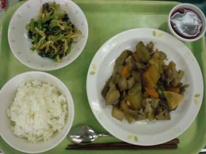 「ごはん、がめに、ぶどうゼリー、やさいのごまだれかけ、牛乳」です。