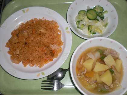 「チキンライス、白いんげん豆の田舎ふうスープ、りんごと白菜のサラダ、牛乳」です。