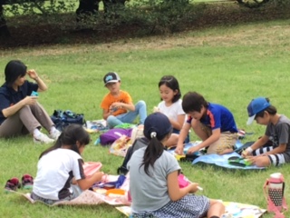 12時半から砧公園の広い芝生でお弁当を食べました。嬉しそうに見せ合いながら食べ始めました。好きな物が詰まったお弁当なので早く食べ終わる子どもが多く、芝の上を走り回っていました。