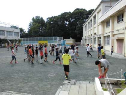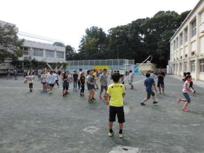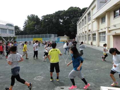 中休みに6年生が連合運動会に向けて長縄を練習していました。