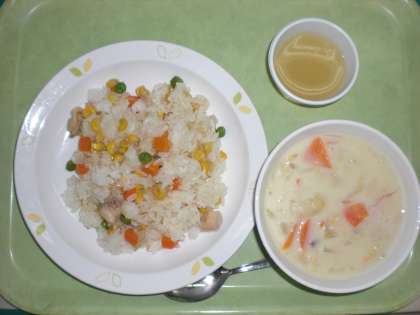 「さんしょくピラフ、クリームスープ、りんごゼリー、牛乳」です。