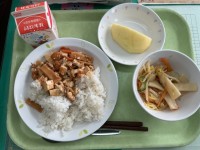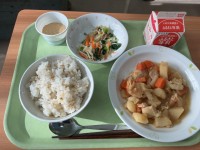 「ひじきごはん、とり肉のてりやき、みそしる、牛乳」です。