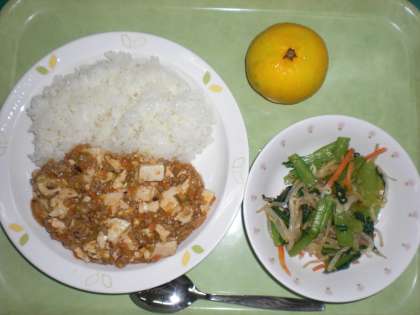「マーボーどん、ナムル、くだもの、牛乳」です。