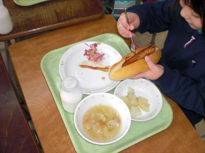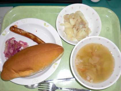 「セルフウィンナーサンド、ザワークラウト、ジャーマンポテト、やさいスープ、牛乳」です。