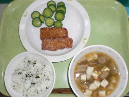 「わかめごはん、いかのかりんとあげ、けんちんじる、きゅうりのひと塩、牛乳」です。