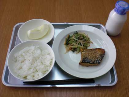 今日の給食は、ごはん・さばの七味焼き・野菜のごまだれかけ・りんご・牛乳です。