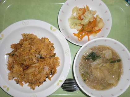 「キムチチャーハン、カリフラワーのちゅうかあえ、白菜とはるさめのスープ、牛乳」です。