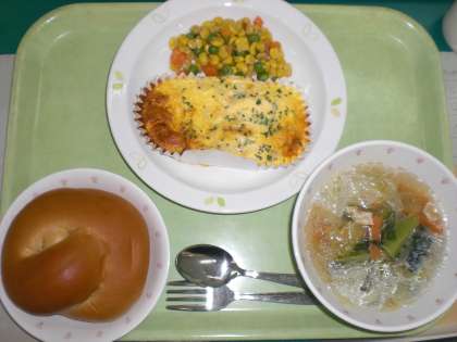 「くろざとうパン、フレンチエッグ、ベジタブルソテー、やさいスープ、牛乳」です。