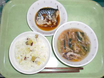 「さつまいもごはん、さかなのしょうがふうみやき、さわにわん、牛乳」です。