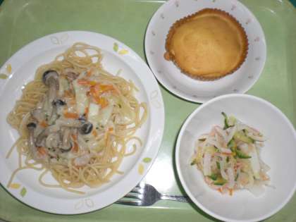 「スパゲティきのこソース、だいこんとツナのサラダ、マロンケーキ、牛乳」です。